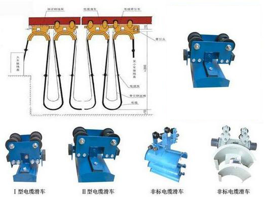 ZYGHC型工字鋼電纜滑車系列為起重機(jī)小車供電的一種導(dǎo)電形式。它有走輪、支架、托板組成,將軟電纜固定在托板上,由牽引架與電纜滑車同步,從而實(shí)現(xiàn)小車供電的目的。