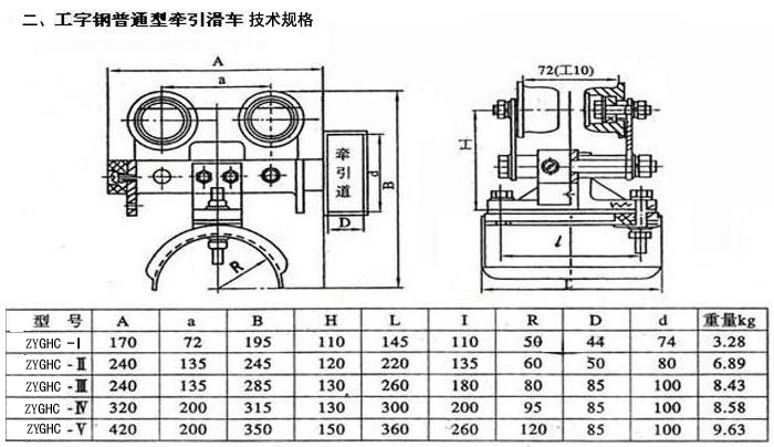 ZYGHC型工字鋼電纜滑車系列分為中載荷型、重載荷型和輕載荷型,因此滑車行走輪為Φ80、Φ63、Φ50的三種。承載能力<50~150kg,每類按托板層數(shù)分為單層、雙層、三層,每類中有三種形式。首端為電纜牽引車,終端為固定掛線架,中間為電纜滑車,該系列滑車分Ⅰ、Ⅱ、Ⅲ、Ⅳ、Ⅴ五種型號,如用戶采用12#、14#、16#或更大號數(shù)工字鋼,可在訂貨時注明,本公司可成套供貨。